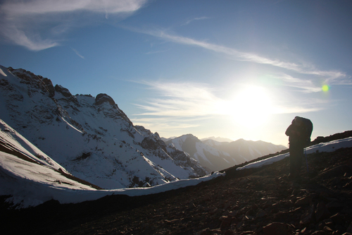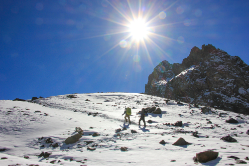 活动说明:早9点半出发,当天继续沿白杨沟一路上行,我们将到达冰川地带,冰川运动隆起的冰碛石像一个个高大台阶挡在路的前方。我们绕过巨大的冰碛石,沿着冰川的边缘向达坂攀登,今天将翻越白杨沟达坂,白杨沟达坂实际上是一座雪山,从山下的冰川漂砾开始到达坂顶端,垂直高度600余米。徒步将近4个小时我们能抵达海拔3862米的达坂顶。达坂垭口有一个的标志物——玛尼堆。白杨沟达坂是南北天山水系的分水岭,达坂以北的希勒木呼和喀拉莫依纳克高山牧场属于前山,翻过达坂以就进入了后山,也就是进入令人生畏的狼塔地区了。晚上扎营在一块像马鞍的营地海拔高度近3000米。 行程:白杨沟—白杨沟达坂—五星营地 用餐:全天含餐 住宿:露营