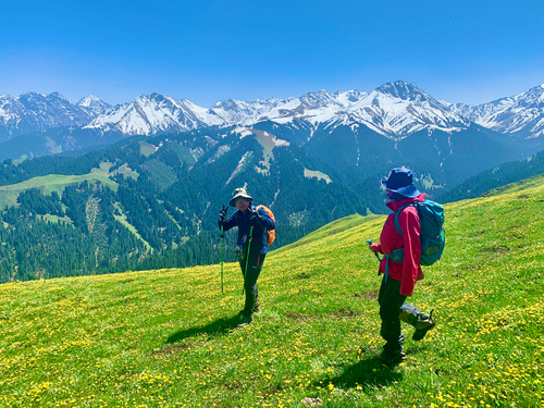 活动说明:早8:00起床收拾好装备吃早饭,带足饮用水。我们正式徒步东喀拉峻大草原,此处海拔要比西喀拉峻要高直接导致春天要来的晚一些,六月初时候最高海拔还有积雪,相比西喀拉峻此处更原生态没有人类痕迹,这里有大片的花海,成群牛羊、峻马,以及哈萨克毡房。如遇到牧民会热情拉你到他家做客。中午时候我们在草原最高点吃午饭。 下午我们一路缓下至塔里景区,有趣是我们特克斯县城跨越到巩留县城,午饭之后一路缓下,下坡前建议带上护膝和调整好登山杖高度来保护膝盖,沿途绵延雪山一直陪伴着我们,整个徒步行程一直下降700米 到达塔里木村,下午5点钟左右到达塔里木;接应车辆汇合营地,晚上9点左右返回至伊宁,到达给大家安排庆功宴,聚餐时候总结一下一路上的的点点滴滴!结束后还有后续行程的朋友们回酒店休息恢复一下体力,如需要预定酒店住宿可以提前联系我们。 行程:东喀拉—塔里木—伊宁 用餐:早餐包含 晚餐庆功宴 住宿:酒店自理